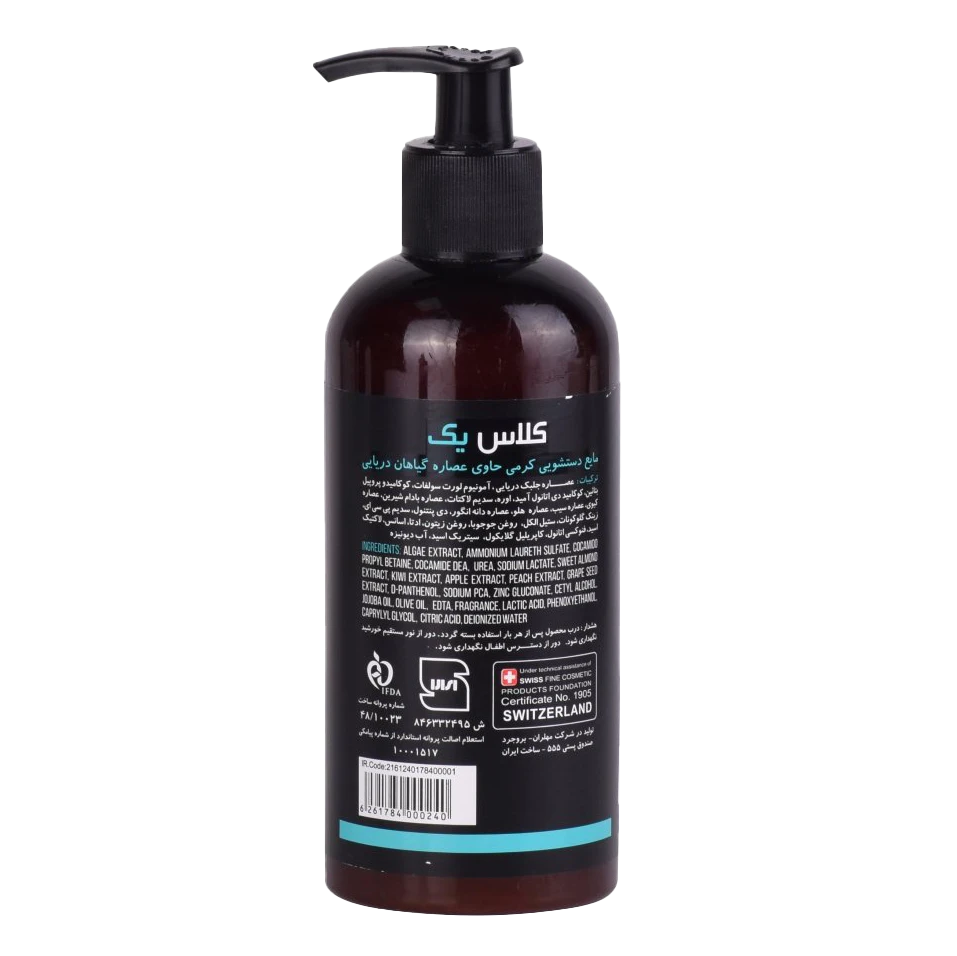 مایع دستشویی کرمی کلاس یک حاوی عصاره گیاهان دریایی، شویندهای عالی برای پاک کردن تمام آلودگیها از روی پوست است. این محصول، با داشتن عصاره جلبک دریایی، یک ضدالتهاب و مرطوبکننده عالی برای پوست است. علاوهبر این، ترشح چربی در پوست را کنترل کرده و پوست شما را روشن میسازد. همچنین این محصول، از فرآیند ترمیم طبیعی پوست حفاظت و پشتیبانی میکند.