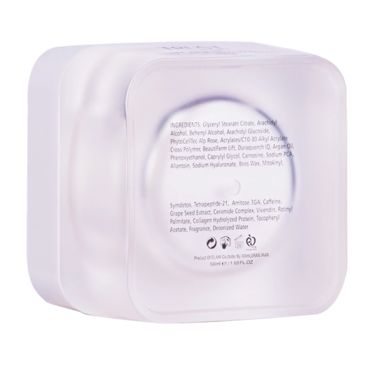 - عملکرد سفتکنندگی و لیفتینگ پوست صورت با داشتن ترکیبات فعال بهبود دهنده کشسانی و مقاومت پوست مثل عصاره سلول بنیادی رز آلپ، BeautiFerm Lift، سدیم هیالورونات، رتینیل پالمیتات، سیمدتوکس، روغن آرگان، شیباتر، تتراپپتاید-۲۱، کمپلکس سرامید، ویوندین و پروتئین کلاژن هیدرولیز شده