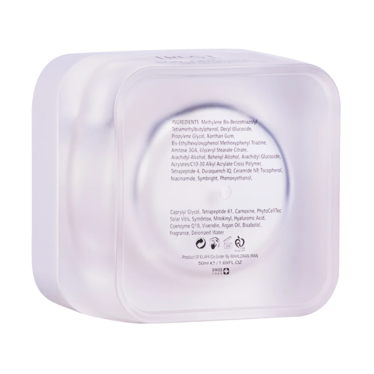 - مهار کننده پرتوهای UV و روشنکننده پوست با داشتن ترکیبات فعال آمیتوز 3GA، نیاسینآمید، سیمبرایت، سیمدتوکس و میتوکینیل