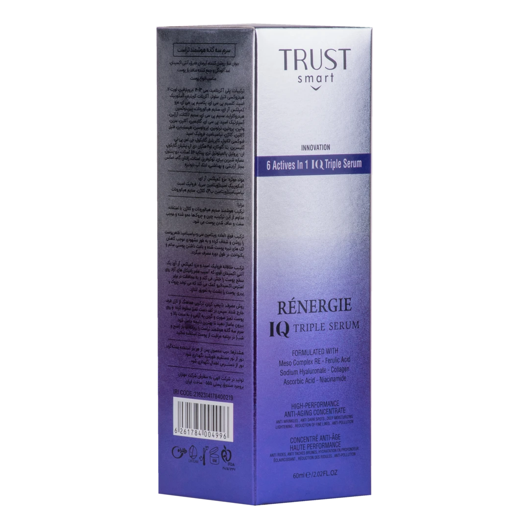 سرم سهگانه هوشمند تراست برای اولین بار به عنوان قویترین محصول حاوی سه نوع سرم روشنکننده، ضد چروک و جوانساز پوست در قالب یک محصول طراحی شده است. سرم روشنکننده حاوی ترکیبات فعال اصلی ویتامین C و نیاسینآمید است که به طور چشمگیری به رفع لکهای پوست و جلوگیری از تیرگی پوست ناشی از عوامل مختلف کمک میکند. این محصول با داشتن ترکیبات فعال فرولیکاسید و مزوکمپلکس آر ای در فرمولاسیون سرم جوانساز خود، توانایی بینظیری برای ساخت سلولهای جدید پوستی و بازسازی و جوانسازی پوست دارد. مزوکمپلکس مورد استفاده در فرمولاسیون این سرم، با داشتن انواع ترکیبات فعال پپتیدی، آمینواسیدها، هیالورونیکاسید، مواد معدنی و انواع ویتامینها، تاثیر منحصر به فردی در بازسازی و جوانسازی پوست دارد. کلاژن و هیالورونیکاسید مورد استفاده در فرمولاسیون سرم ضد چروک هم بعد از استفاده از سرم بر روی پوست تاثیر همافزایی با مزوکمپلکس و فرولیک در آبرسانی، رفع چین و چروکها و افزایش استحکام پوست دارد. بنابراین سرم سهگانه هوشمند تراست با داشتن سه نوع سرم با ترکیبات فعال آبرسان، افزایشدهنده استحکام پوست، جوانکننده و ضد چروک و روشن کننده پوست، به عنوان محصولی متفاوت و بینظیر به بازار معرفی گردید.
