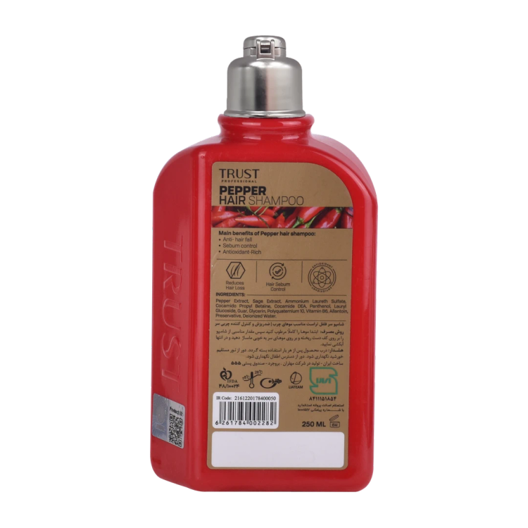 عصاره فلفل موجود در شامپو سر فلفل تراست، با تحریک فولیکولهای مو، به رشد بهتر مو و افزایش سلامت آن کمک میکند. علاوهبراین با افزایش گردش خون در پوست سر، از ریزش تارهای مو پیشگیری میکند. همچنین این محصول با داشتن عصاره مریمگلی در ترکیبات خود، ضمن کنترل چربی پوست، باعث براق شدن مو و رنگپذیری موهای خاکستری و بیرنگ میشود.